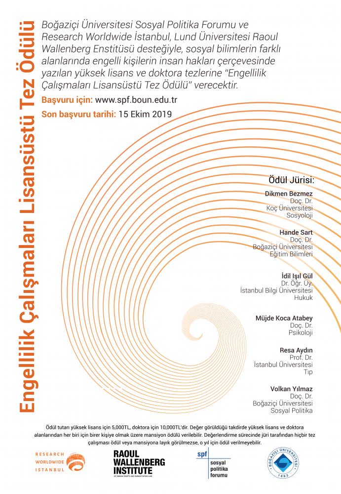 Bogazici University Social Policy Forum and Research Worldwide Istanbul, with the support of Lund University Raoul Wallenberg Institute, calls for application for the 2019 Disability Studies Graduate Thesis Award for master's and Ph.D. theses on issues pertaining to the human rights of people with disabilities. This award aims to encourage young scholars from different fields of social sciences to conduct original empirical disability studies research in Turkish universities.
