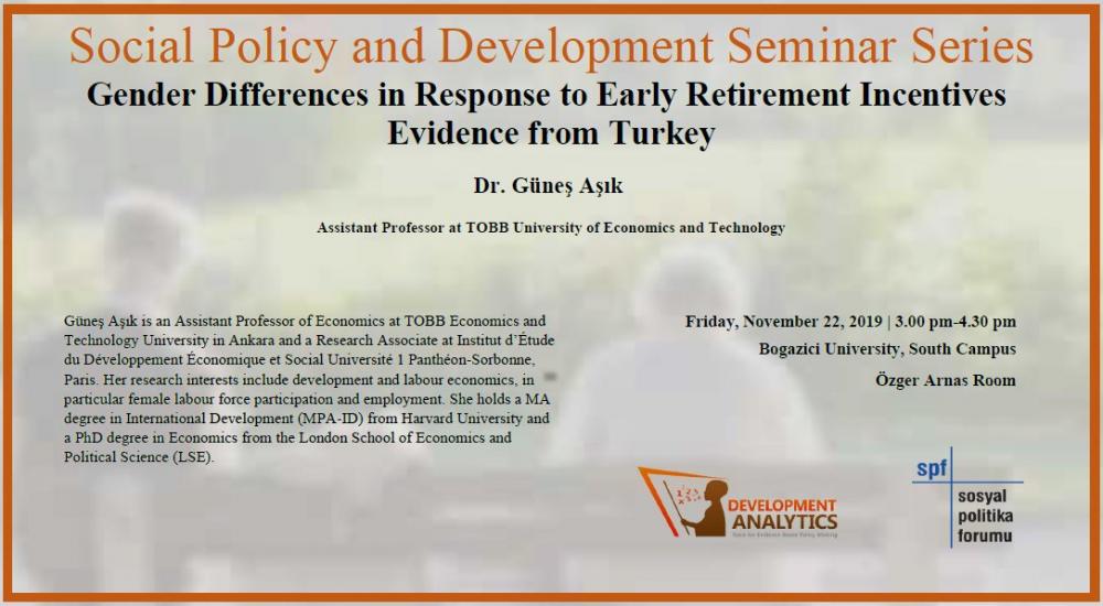 On Friday November 22, Social Policy Forum will host a seminar on “Gender Differences in Response to Early Retirement Incentives: Evidence from Turkey” as part of "Social Policy and Development Seminar Series" jointly hosted with Development Analytics. For more information on the paper and bio of the presenter, please follow the Eventbrite link and RSVP for the seminar by Thursday, 21 November 5 PM.