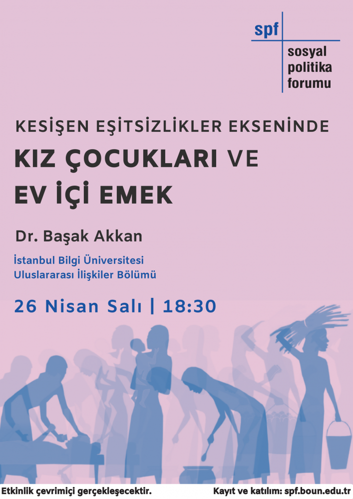 Dr. Başak Akkan (İstanbul Bilgi Üniversitesi, Uluslararası İlişkiler AD) 26 Nisan 2022 (Salı) 18:30'da 'Kesişen Eşitsizlikler Ekseninde Kız Çocukları ve Eviçi Emek' başlıklı konuşmasını çevrimiçi (Zoom) gerçekleştirecek.