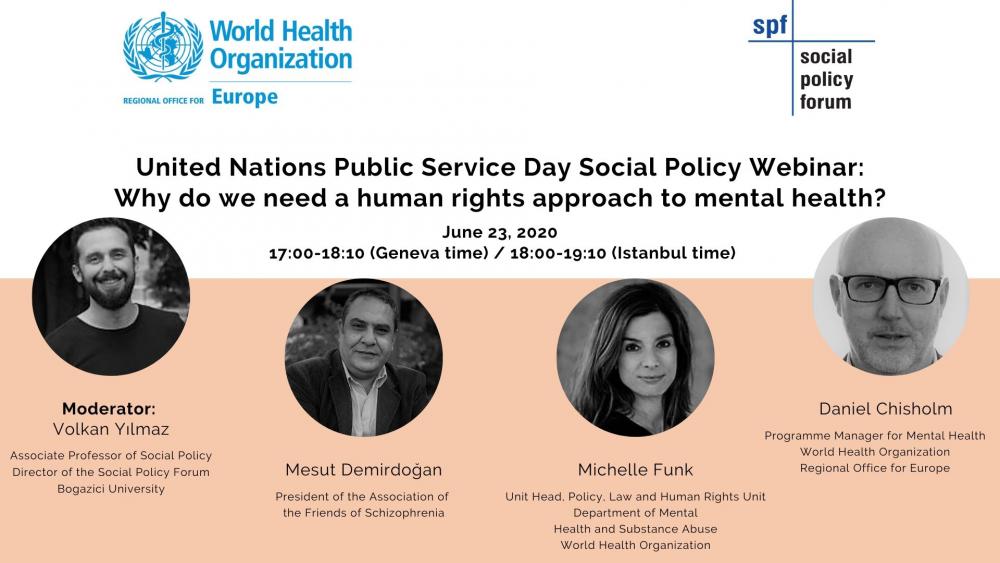 Boğaziçi Üniversitesi Sosyal Politika Forumu ve Dünya Sağlık Örgütü Türkiye Ofisi “Neden ruh sağlığında insan hakları yaklaşımına ihtiyacımız var?” başlıklı internet semineri gerçekleştirecektir. Seminer, Birleşmiş Milletler Kamu Hizmeti Günü kapsamında 23 Haziran 2020 İstanbul saatiyle 18.00’da gerçekleşecektir (Cenevre saatiyle 17:00’de).