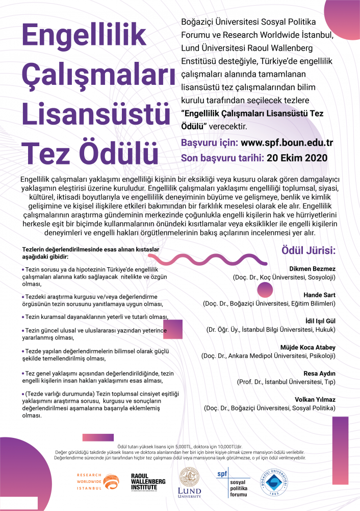 2018 yılı itibariyle Boğaziçi Üniversitesi Sosyal Politika Forumu ve Research Worldwide İstanbul, Lund Üniversitesi Raoul Wallenberg Enstitüsü desteğiyle, Türkiye’de engellilik çalışmaları alanında tamamlanan lisansüstü tez çalışmalarından bilim kurulu tarafından seçilecek tezlere “Engellilik Çalışmaları Lisansüstü Tez Ödülü” vermektedir. Bu ödül üniversitelerde sosyal bilimlerin farklı alanlarında engellilik alanında insan hakları yaklaşımını temel alan lisansüstü düzeyinde özgün araştırmalar yapılmasını özendirmeyi amaçlamaktadır.