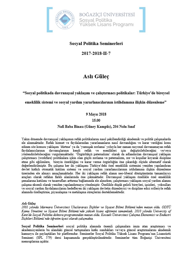 Sosyal Politika Seminerleri 2017-2018: Sosyal politikada davranışsal yaklaşım ve çalıştırmacı politikalar: Türkiye’de bireysel emeklilik sistemi ve sosyal yardım yararlanıcılarının istihdamına ilişkin düzenleme